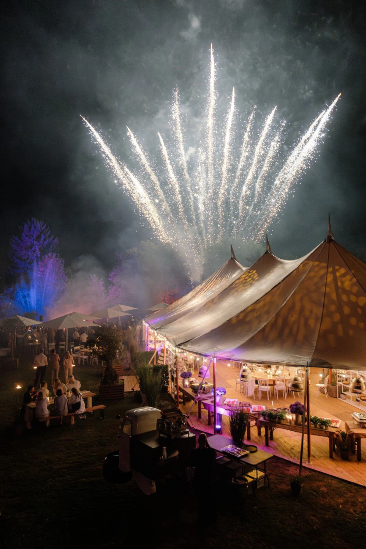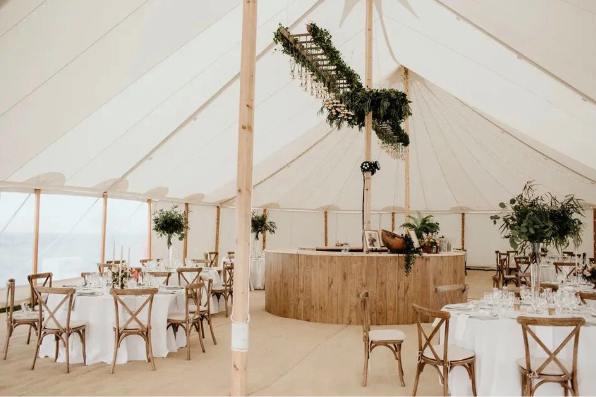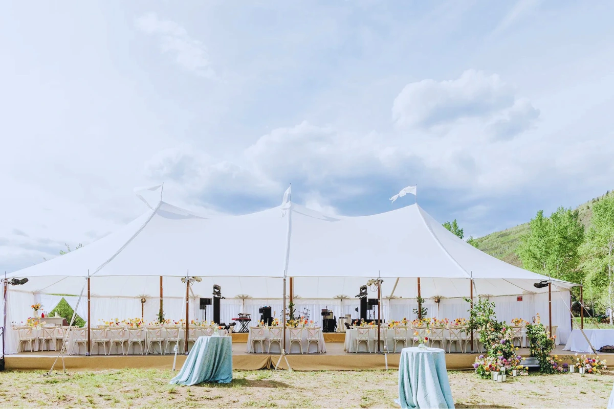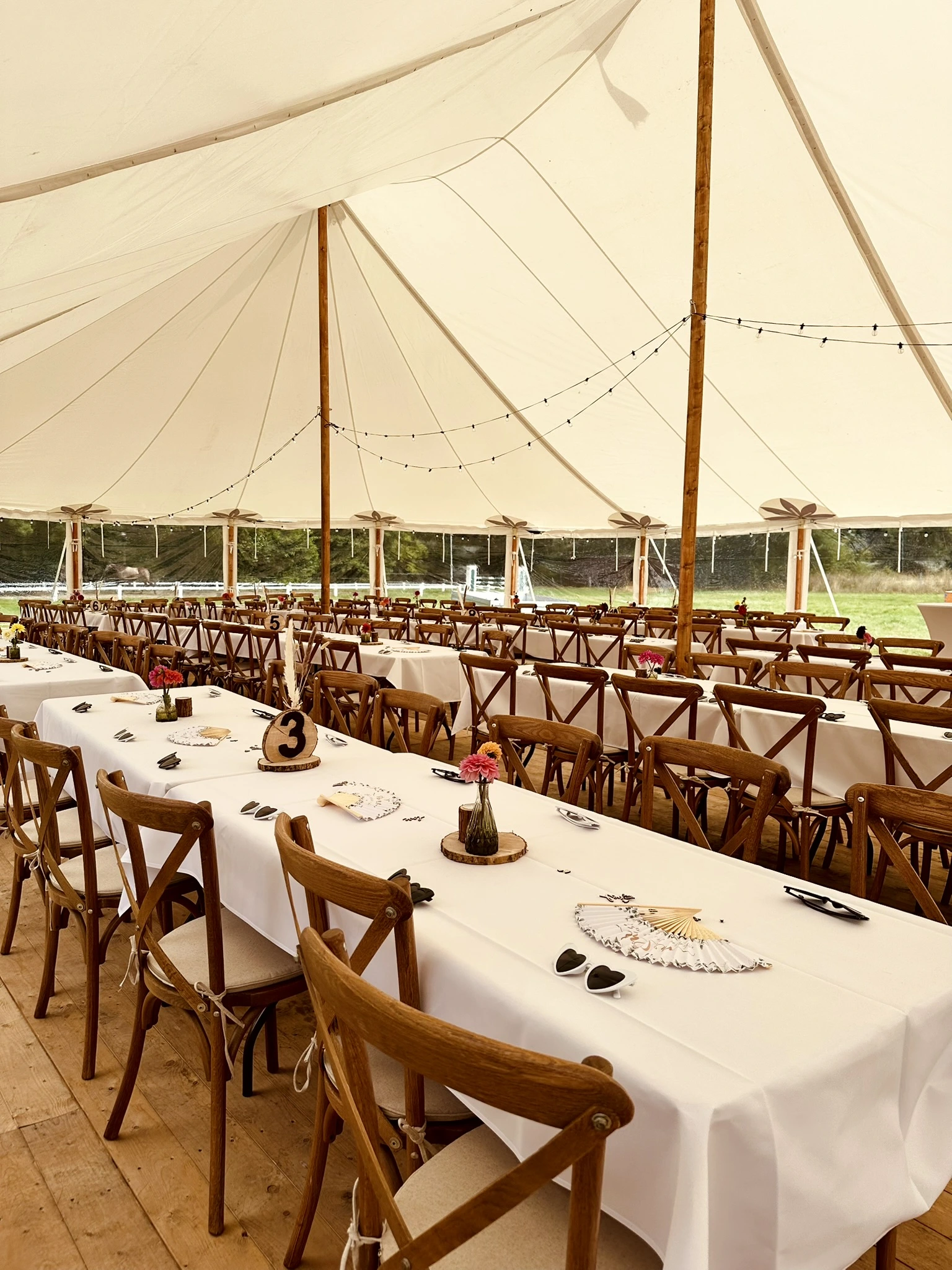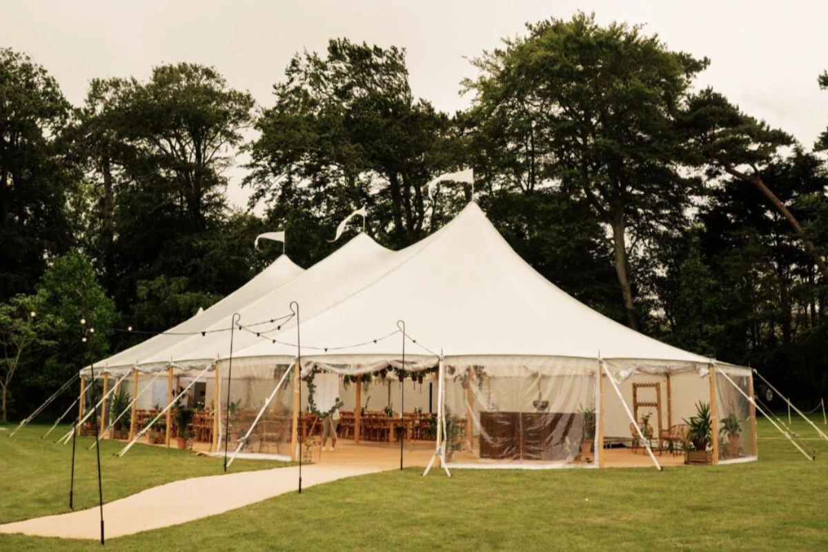 Das Zelt ist standardmäßig offen und lässt sich je nach Wetterlage flexibel mit Seitenwänden ausstatten. Aufgrund der Größe und Stabilität eignet sich dieses Sailclothzelt ideal für Hochzeiten, Galas, Firmenevents und größere Eventformate.