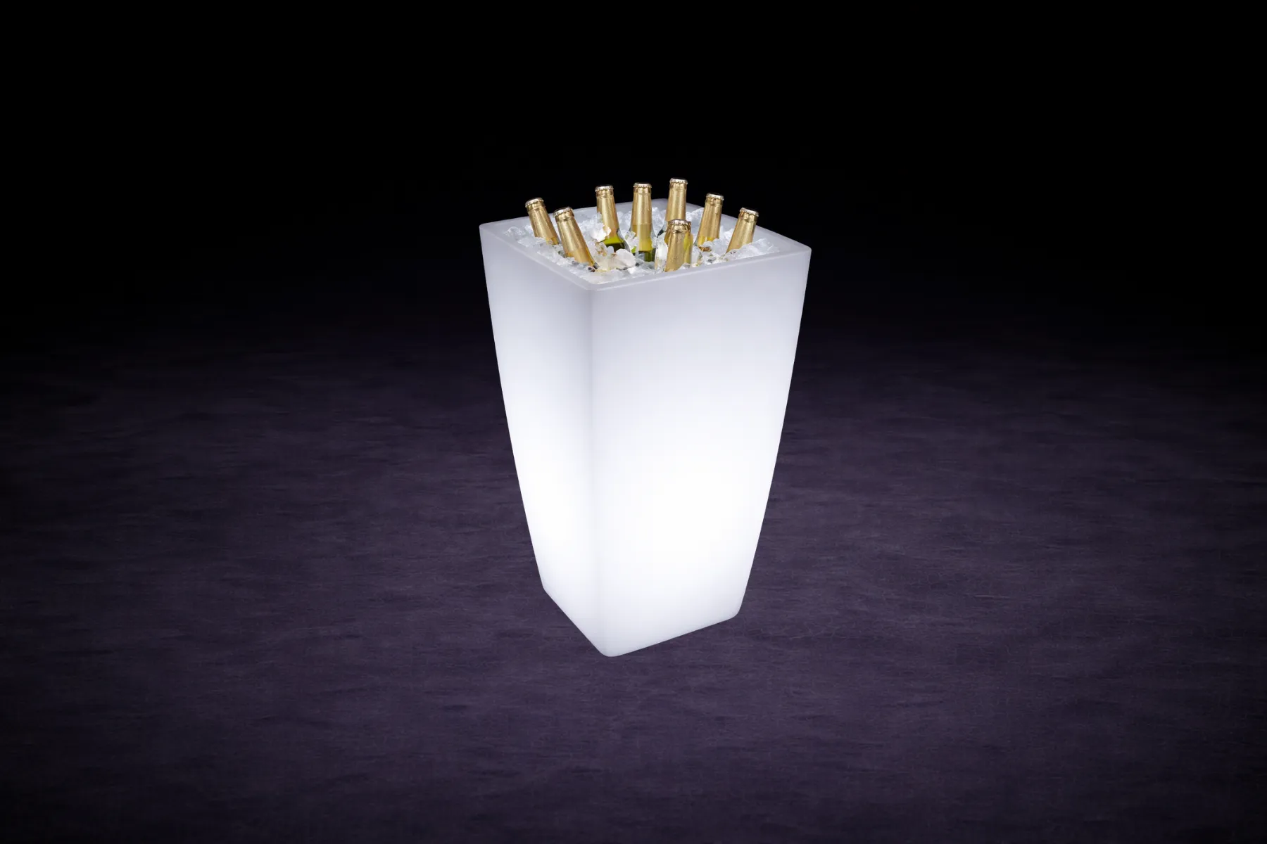 Leuchtender hoher LED Flaschenkühler als elegantes Design-Highlight für Stehtische, Bars und VIP-Bereiche bei Events und Feiern