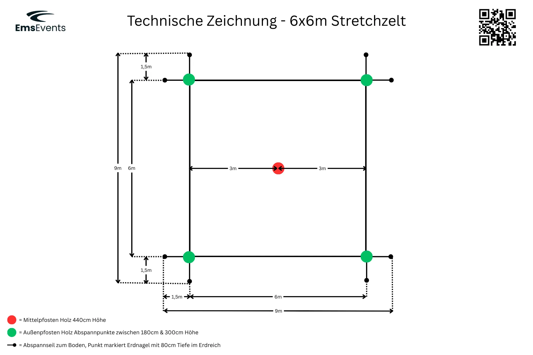 1 zentraler Innenpfosten mit ca. 3,6 m Höhe (maximale Innenhöhe)