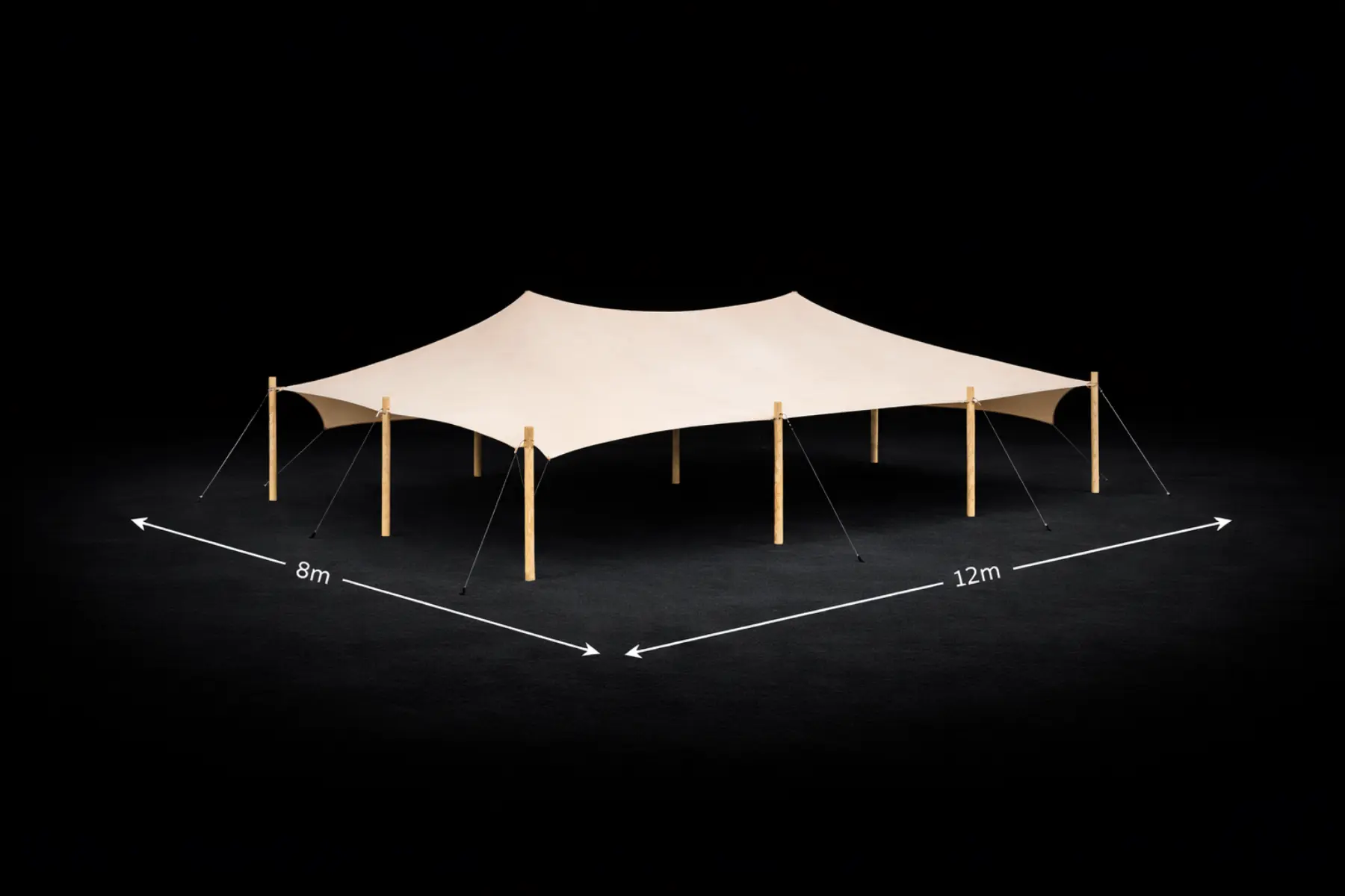 Wer ein stilvolles Zelt mieten möchte, profitiert bei diesem Stretchzelt von einer variablen Aufbauform, die sich flexibel an unterschiedliche Flächen und Nutzungskonzepte anpassen lässt. Die Kombination aus den acht außenliegenden Robinienstangen und den zwei zentralen Innenpfosten sorgt für Stabilität und eine offene, moderne Optik.